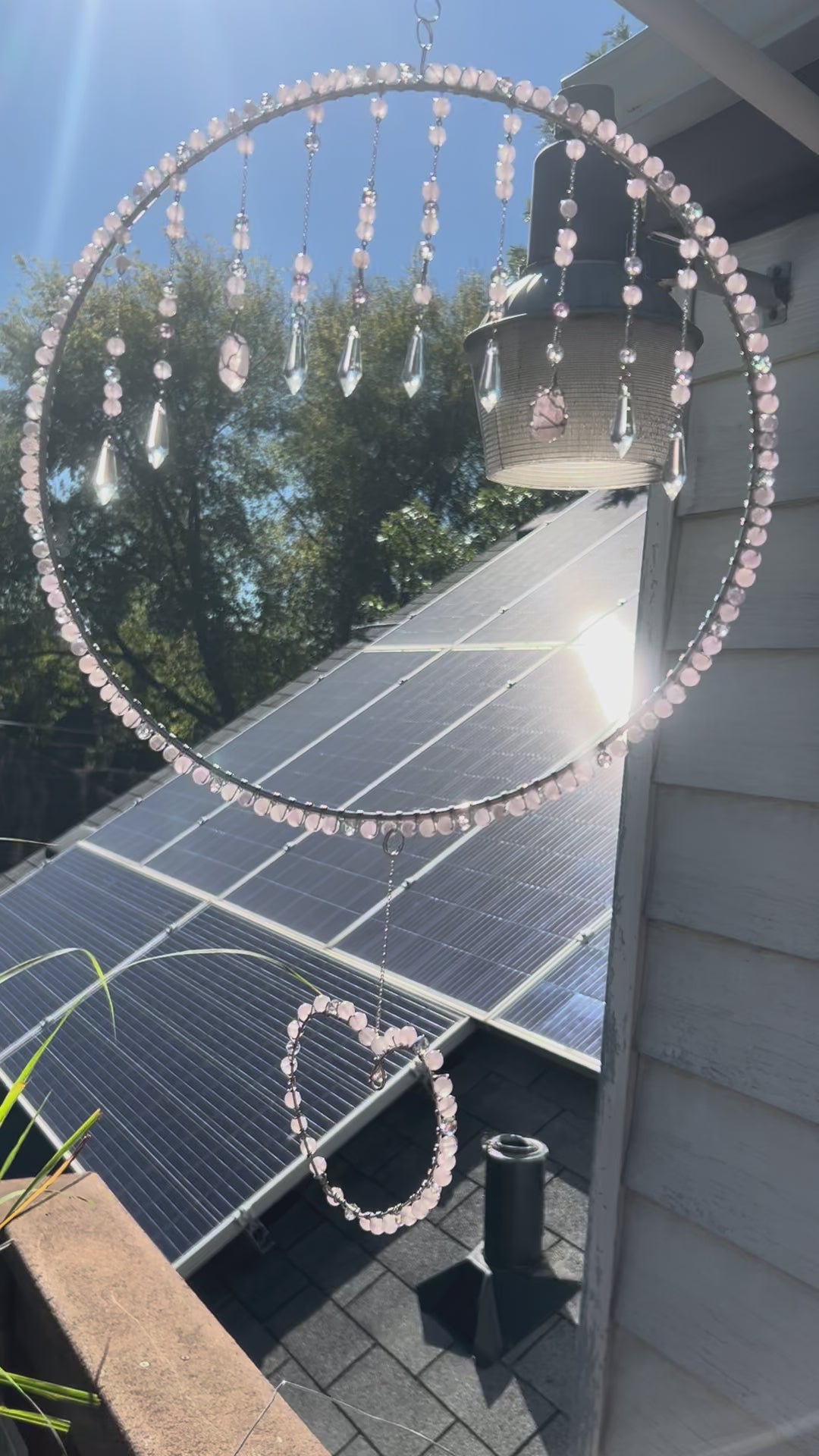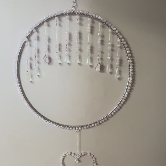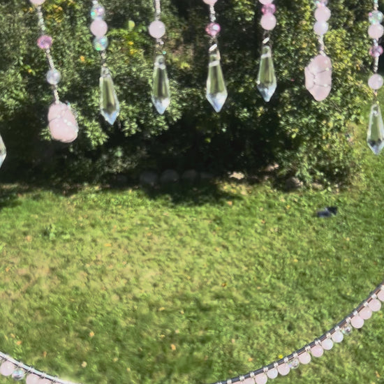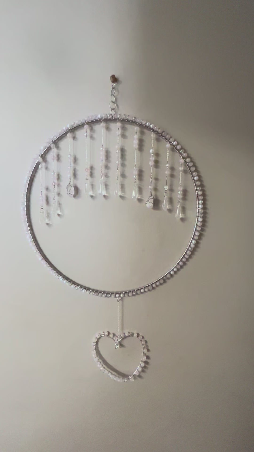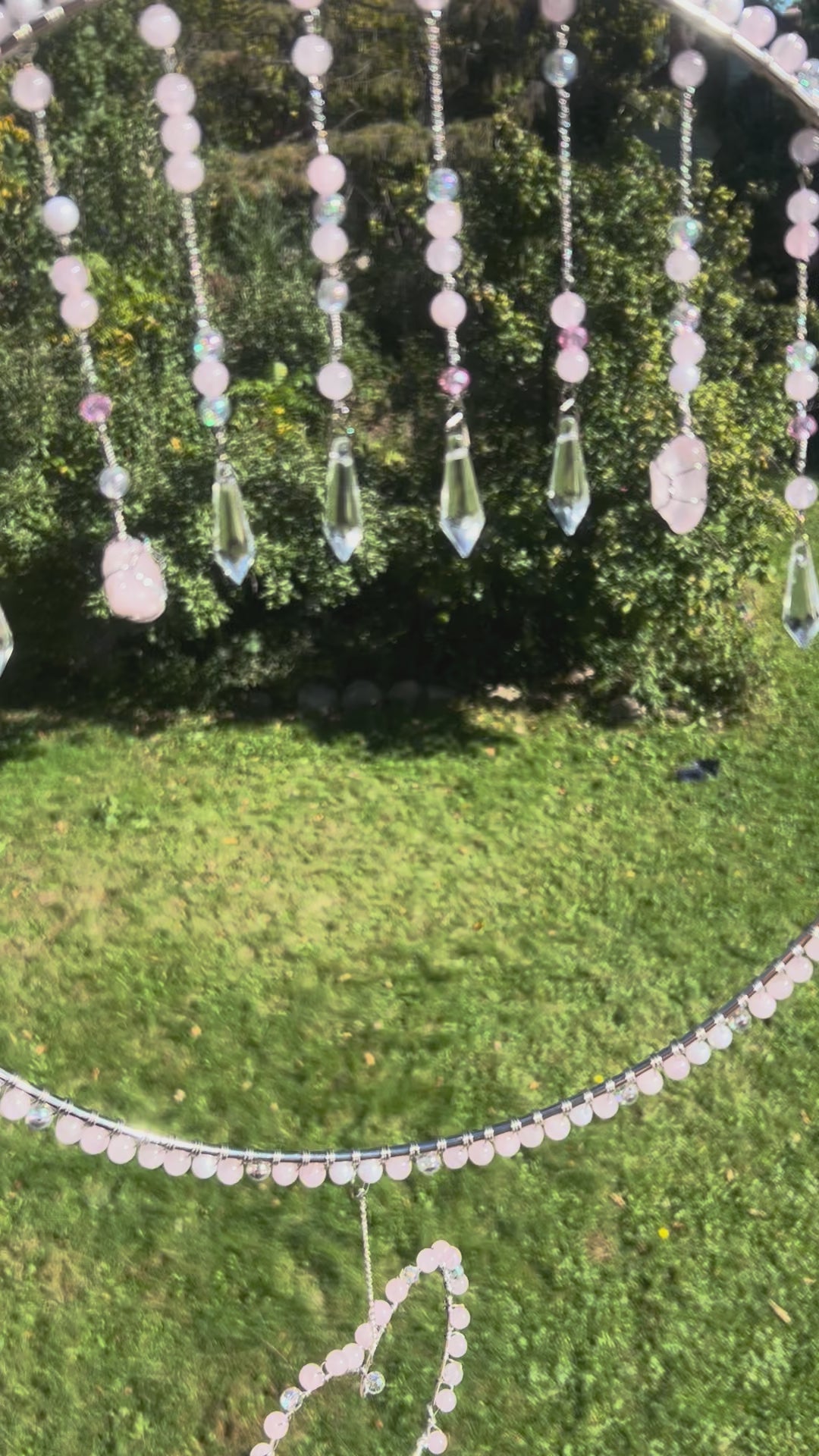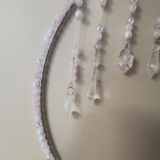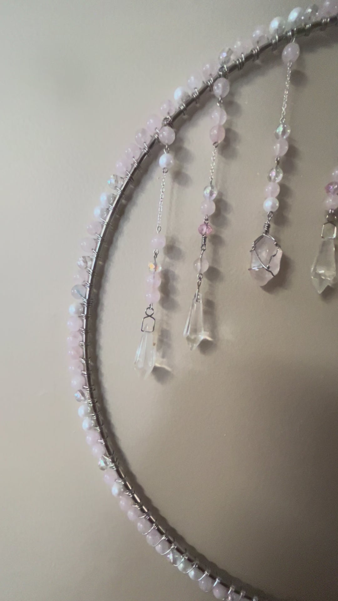 Rose Quartz chandelier wall hanging. It is 26 inches long. The hoop size is 14 inches long."Add a touch of magic to any room with our Rose Quartz chandelier wall hanging! This 26 inch piece features a 14 inch hoop, making it the perfect size for any space. Bring positivity and love into your home with this beautiful piece."