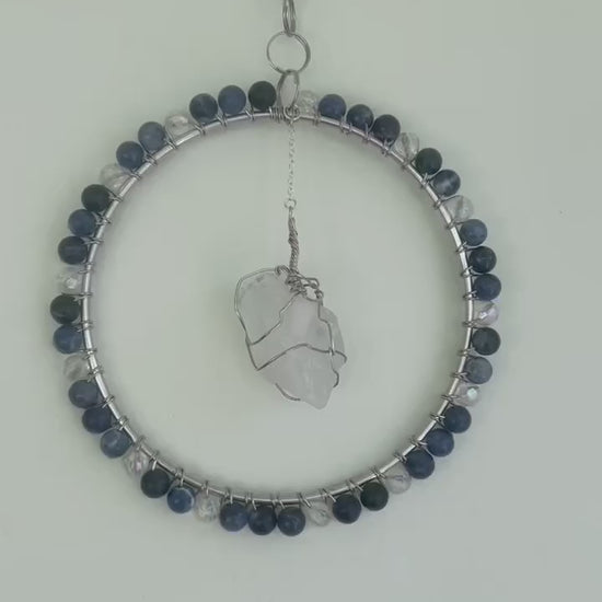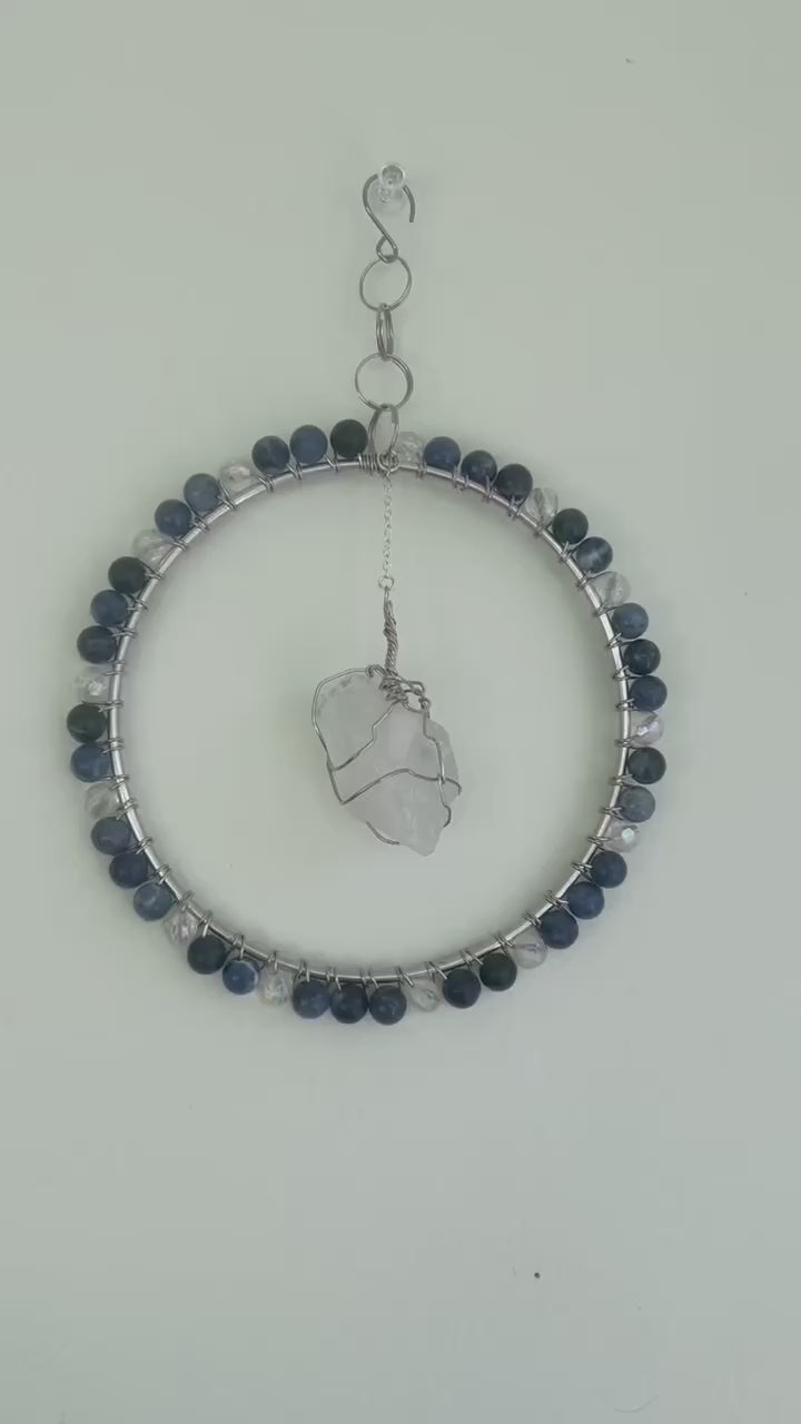 Elevate the energy and aesthetic of any space with this 8-inch long combination of Sodalite and Quartz, enclosed in a 5-inch hoop. Enhance communication and bring a sense of tranquility and love with the power of this enchanting wall hanging.
